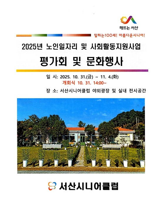 1. 행사명 : 2025년 노인일자리 및 사회활동지원사업 평가회 및 문화행사 2. 일 시 : 2025년 10월 31일 (금) ~ 11월 4일 (화), 개회식 10월 31일 14:00 ~ 3. 장 소 : 서산시니어클럽 야외 광장 및 실내 전시공간 4. 세부프로그램 ▣ 전 시 - 노인일자리 사업 참여자 활동사진 - 10여종의 국화 품종 화분 및 분재 - 지역작가들의 작품(켈리그라피, 유화, 수재화등) ▣ 판 매 - 국화 화분 - 나무도마, 나무시계, 어랭이(대나무), 생활소품등 - 감태, 김, 두부 등 ▣ 노인일자리사업 참여자 사례발표 - 노인공익활동 참여자 1명, 노인역량활용 참여자 1명 ▣ 작은 음악회 - 일 시 : 2025년 10월 31일(금) 14:00~ - 장 소 : 카페 가재미38 - 공연팀 : 어울소리(지역소리 아마추어 기타팀) - 내 용 : 70, 80년대 히트송
